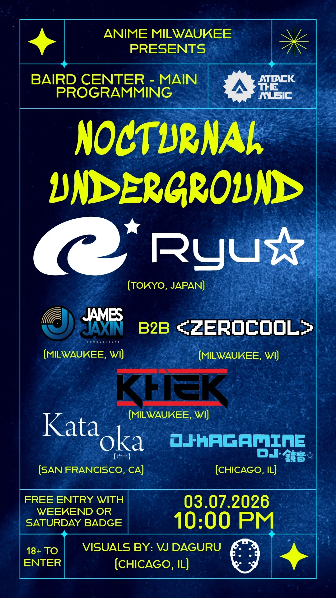 Nocturnal Underground is 18+ to enter Per Milwaukee law and Baird Center Rules. Age verification wristbands are required for entry.
